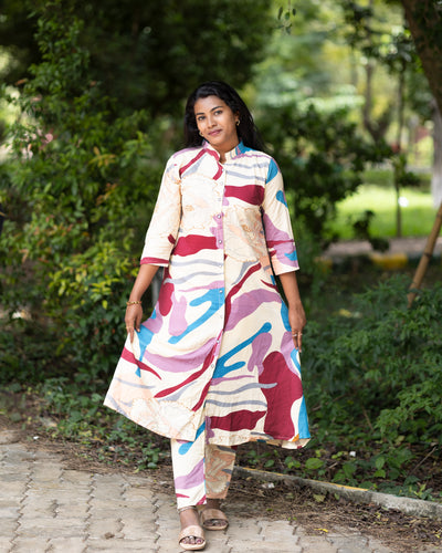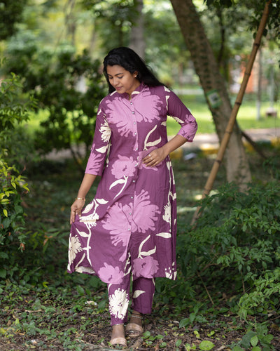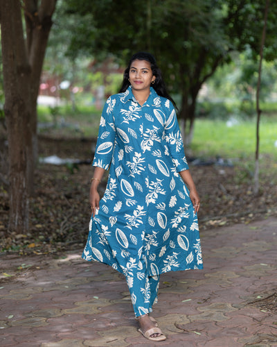 Women's Jaipuri Floral Print Cotton Co-Ord Set | Front Button Long Kurta with Pant | Stylish Ethnic Set
