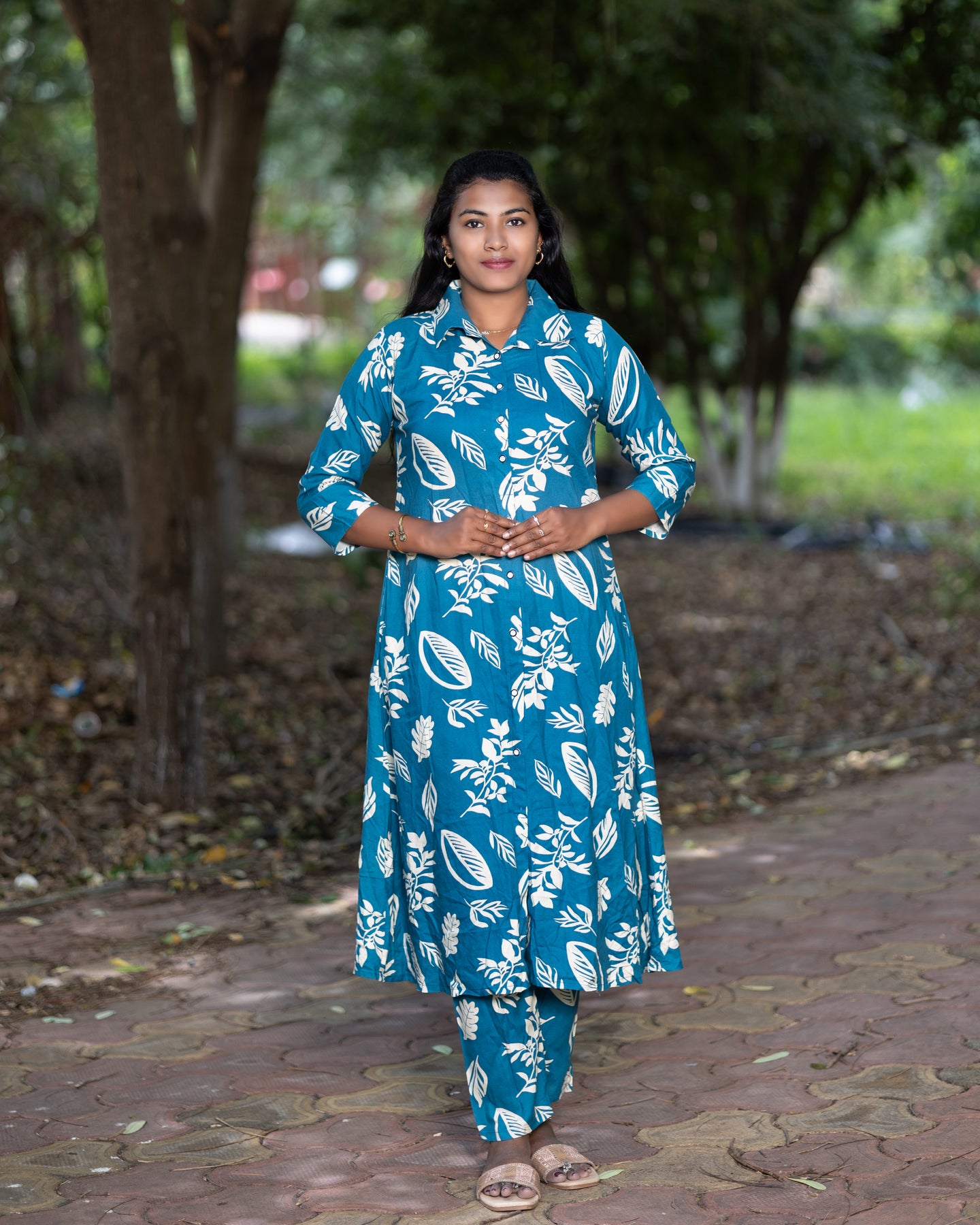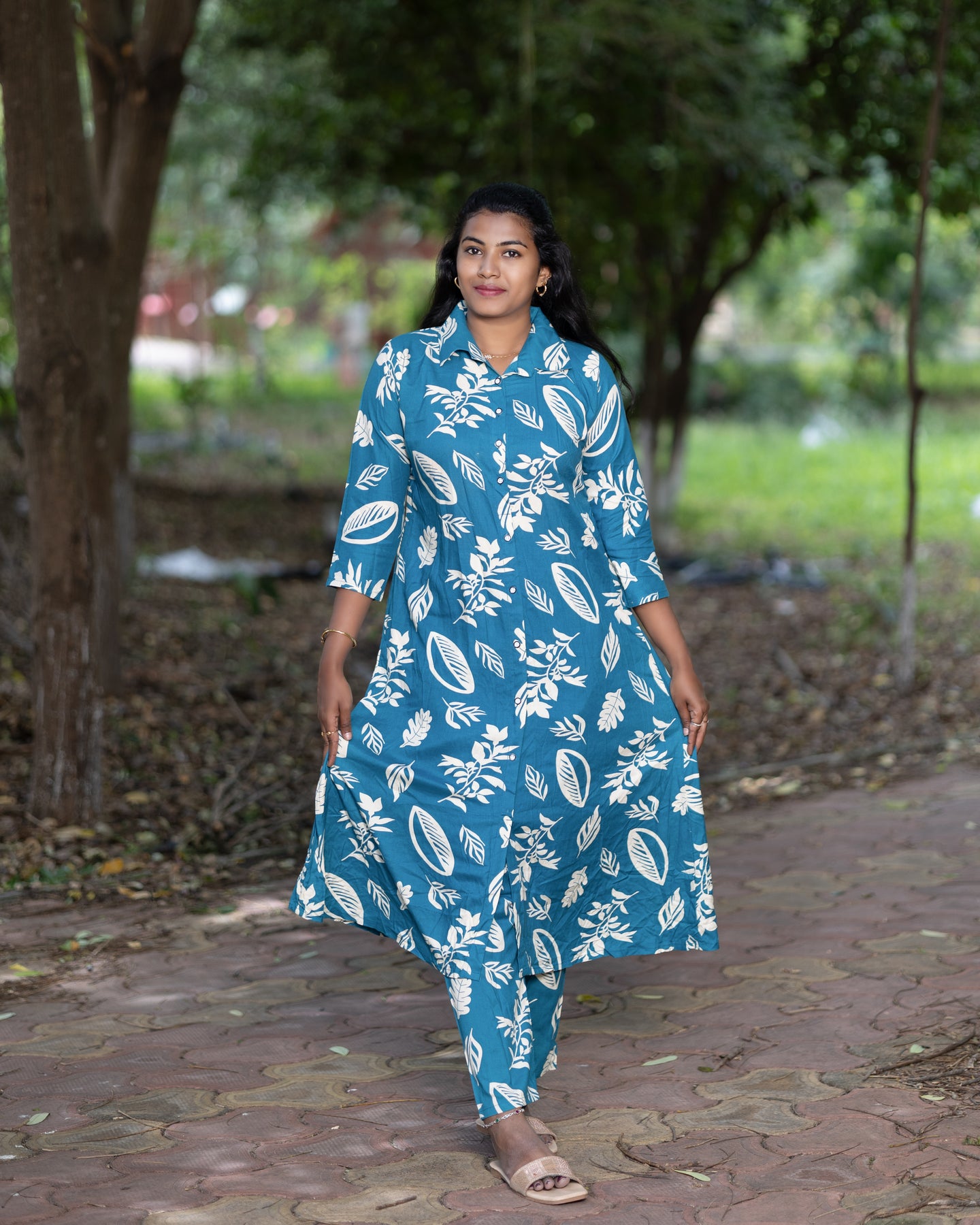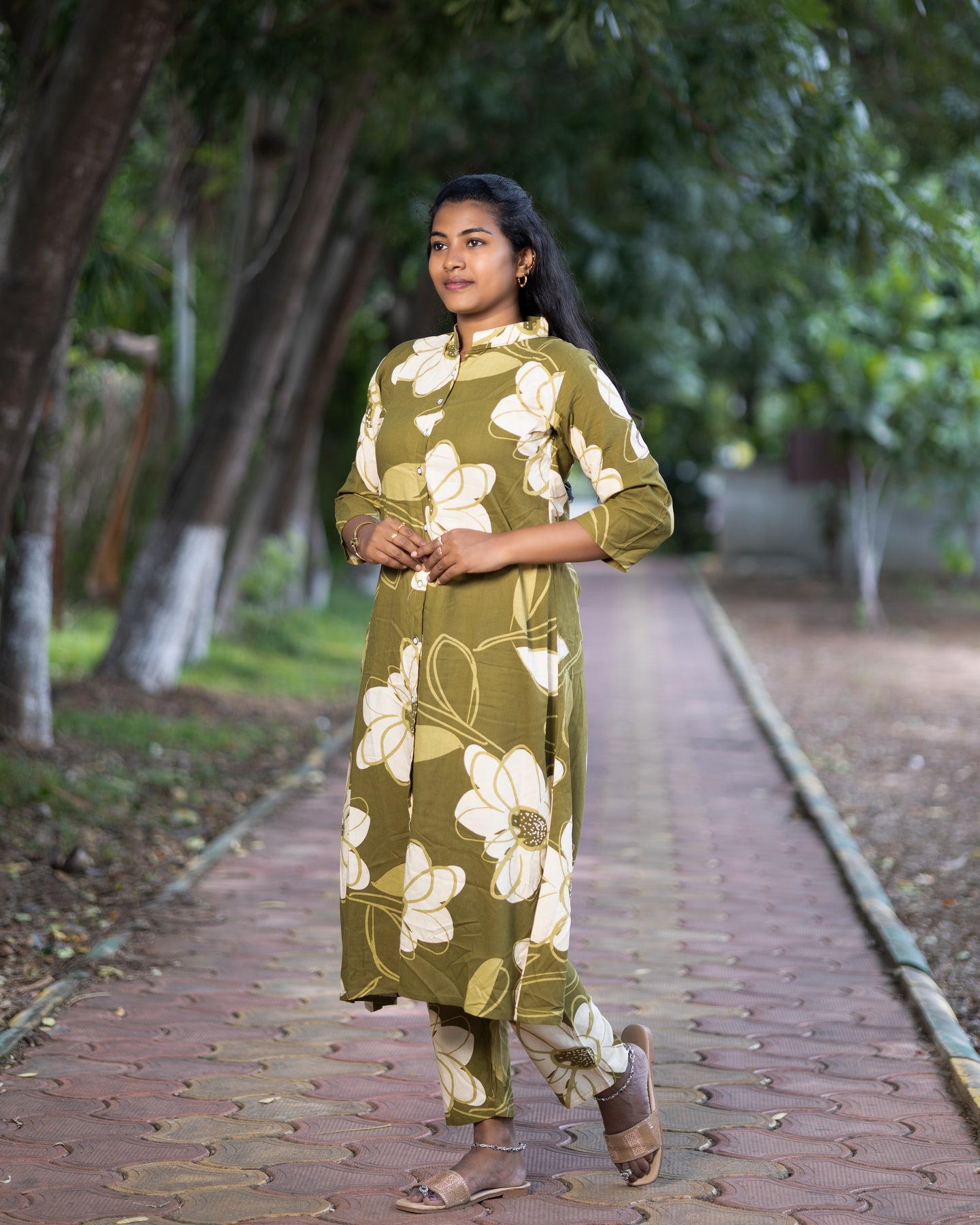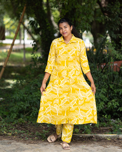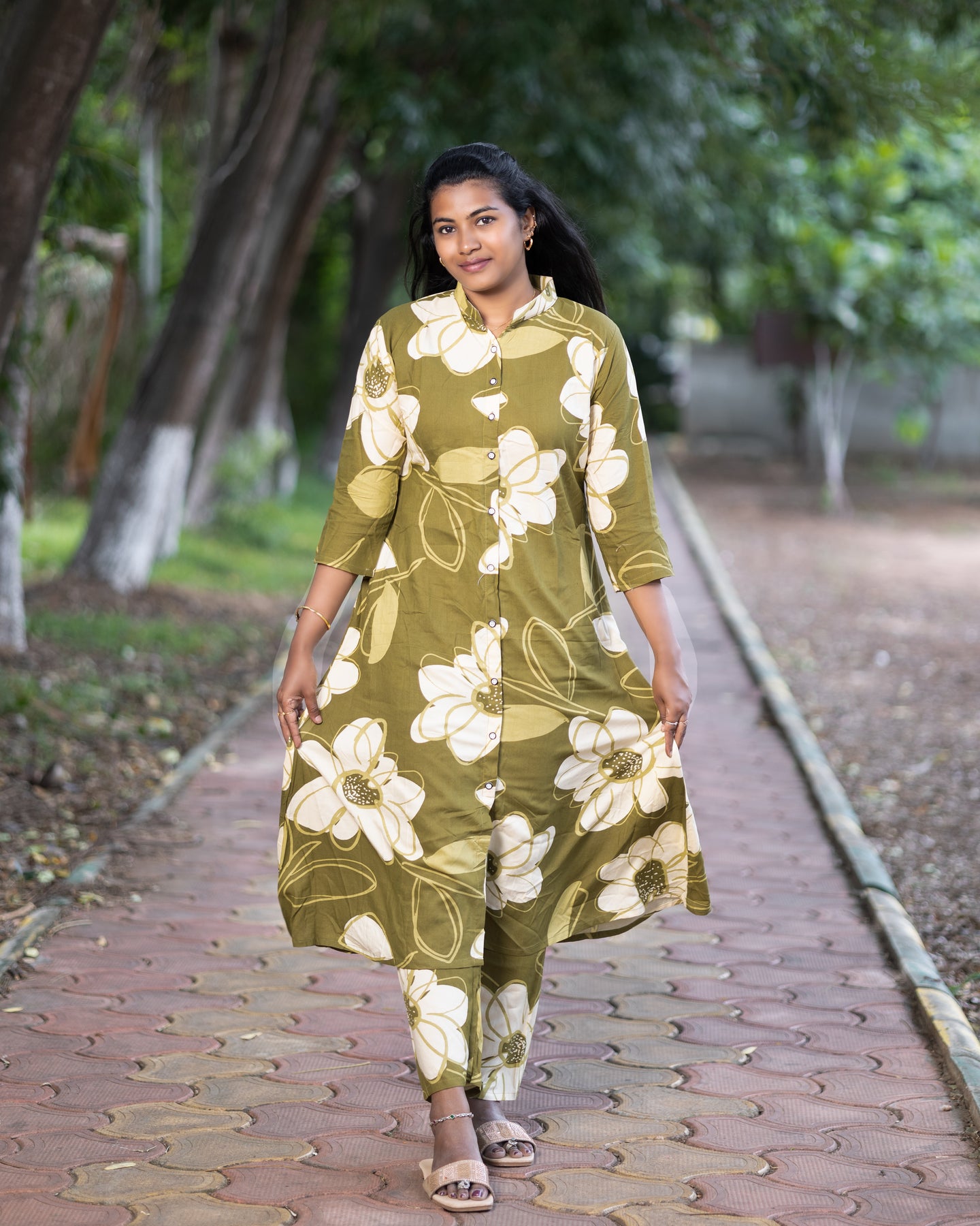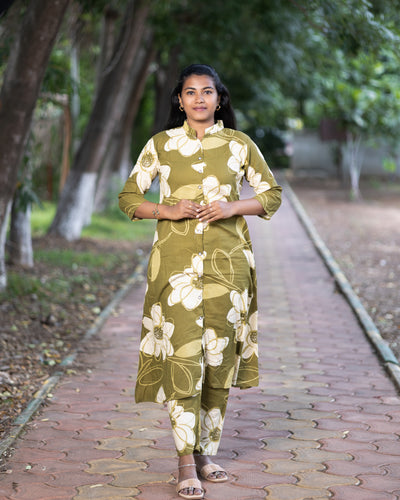 Add a vibrant touch to your wardrobe with this elegant Jaipuri floral print co-ord set. Crafted from soft and breathable cotton fabric, this stylish two-piece set includes a front-buttoned, long flared kurta paired with matching straight-fit pants. Featuring bold white floral patterns on an olive base, the set is perfect for casual outings, festive gatherings, and everyday comfort. Designed with 3/4th sleeves and a mandarin collar, it offers a modern twist to traditional wear.