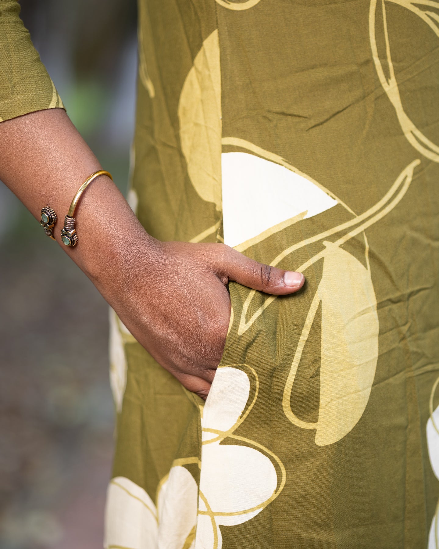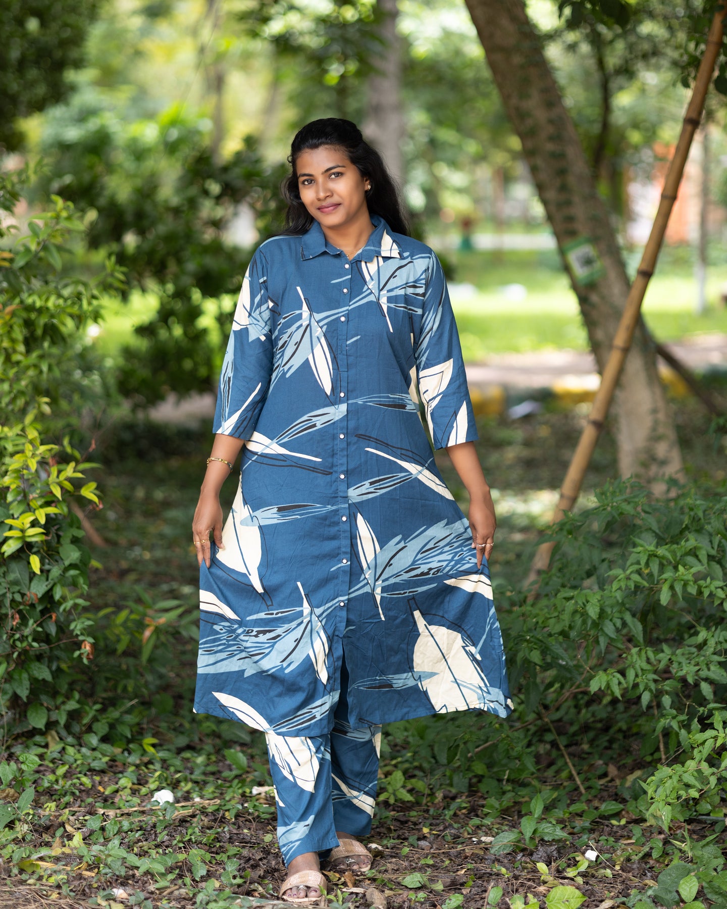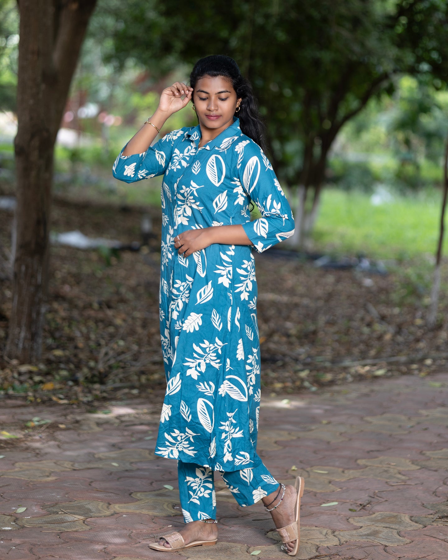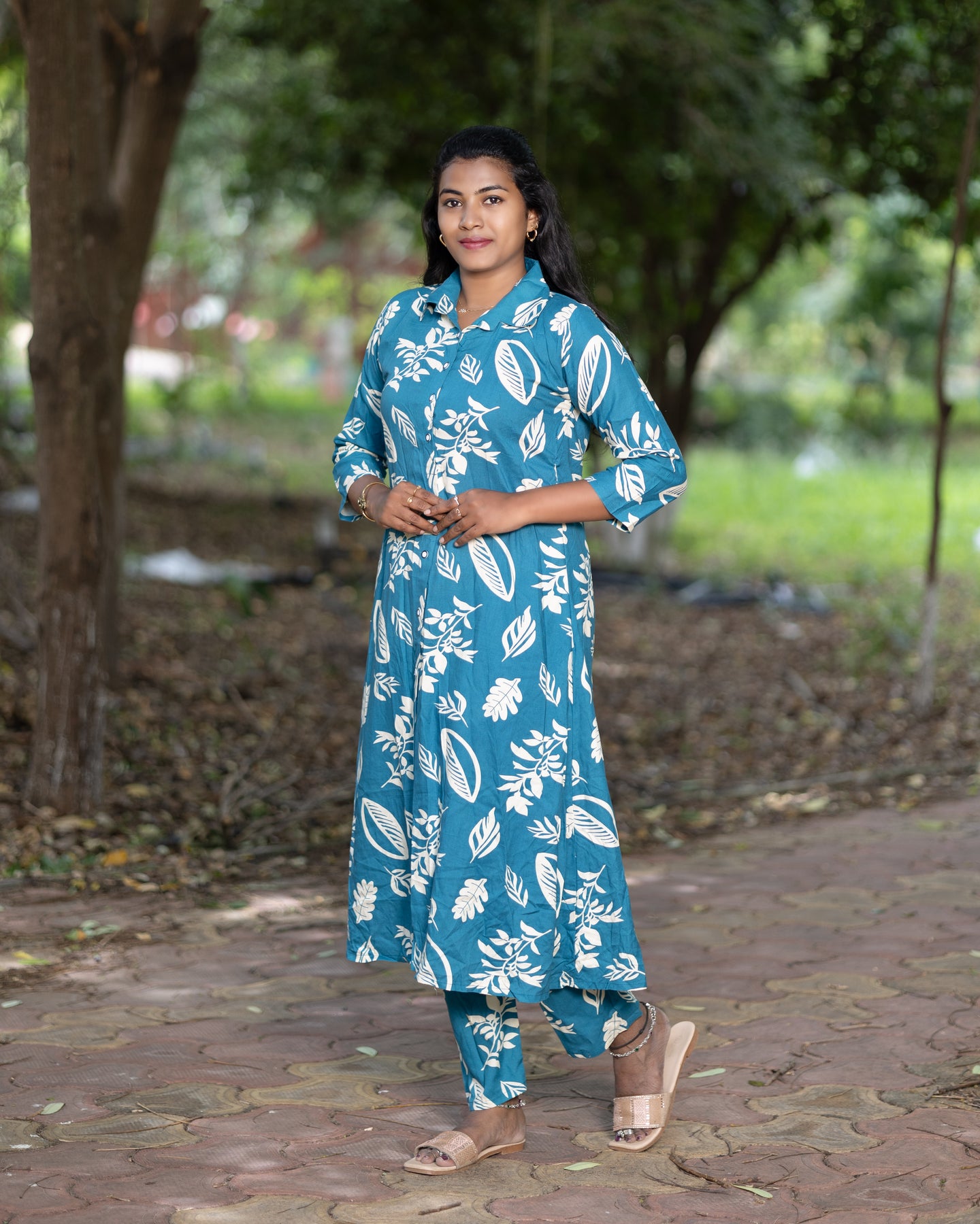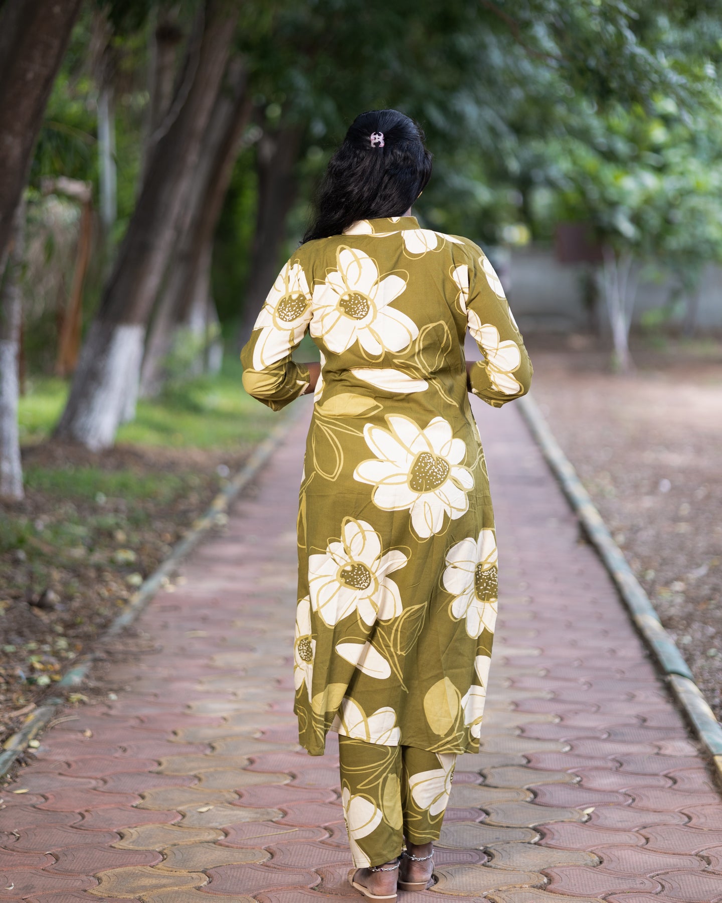 Add a vibrant touch to your wardrobe with this elegant Jaipuri floral print co-ord set. Crafted from soft and breathable cotton fabric, this stylish two-piece set includes a front-buttoned, long flared kurta paired with matching straight-fit pants. Featuring bold white floral patterns on an olive base, the set is perfect for casual outings, festive gatherings, and everyday comfort. Designed with 3/4th sleeves and a mandarin collar, it offers a modern twist to traditional wear.
