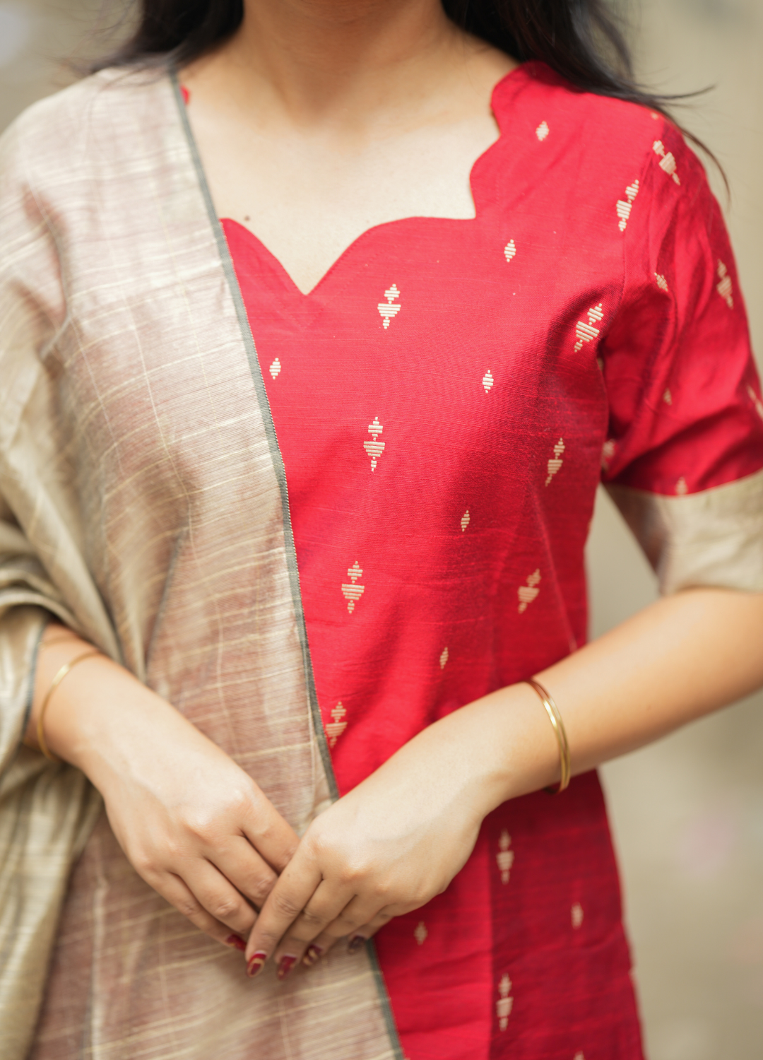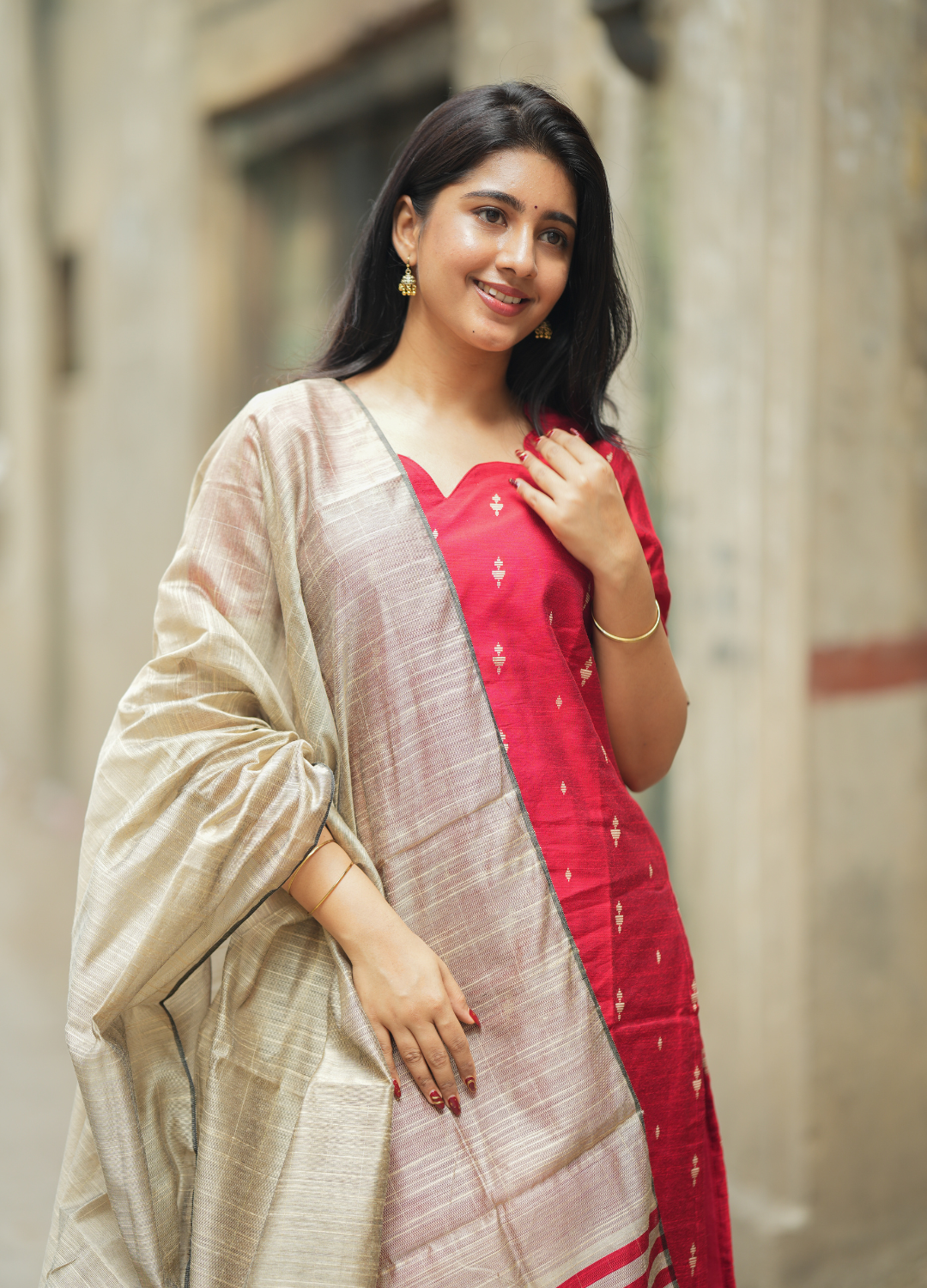 Enhance your ethnic wardrobe with this Rani Pink Raw Silk Kurti, crafted from high-quality raw silk fabric that offers a rich texture and elegant drape. The vibrant rani pink colour adds a royal touch, while subtle woven motifs bring out a timeless traditional charm. Designed for comfort and versatility, this kurti is ideal for festive occasions, office wear, family functions, and casual ethnic styling.