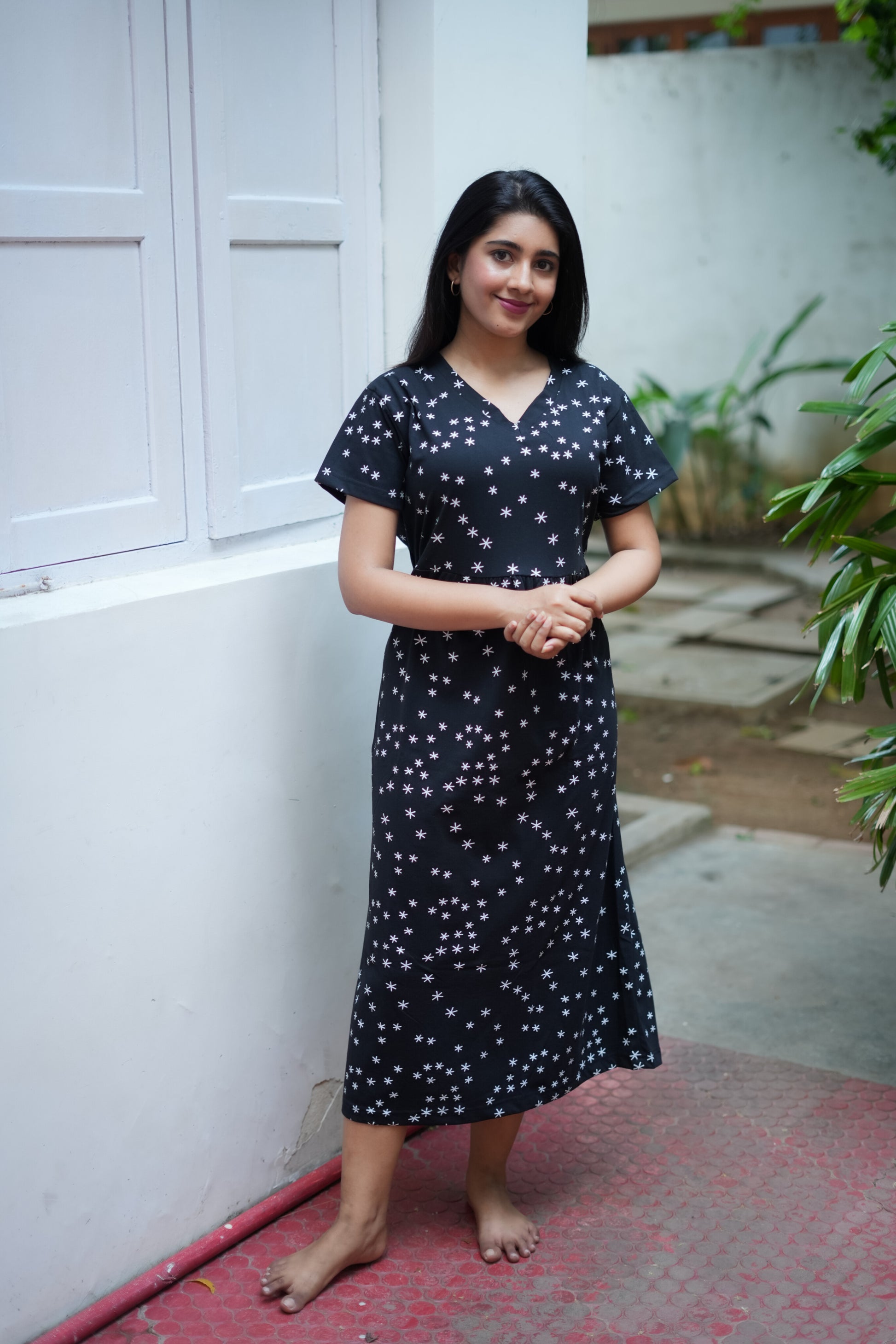 Step into effortless style with our Black Printed Casual Cotton Dress. Crafted from breathable, soft cotton. The V-neckline and relaxed fit make it perfect for casual outings, work-from-home days, or laid-back weekends. Pair it with flats or sneakers for a chic, comfortable ensemble.